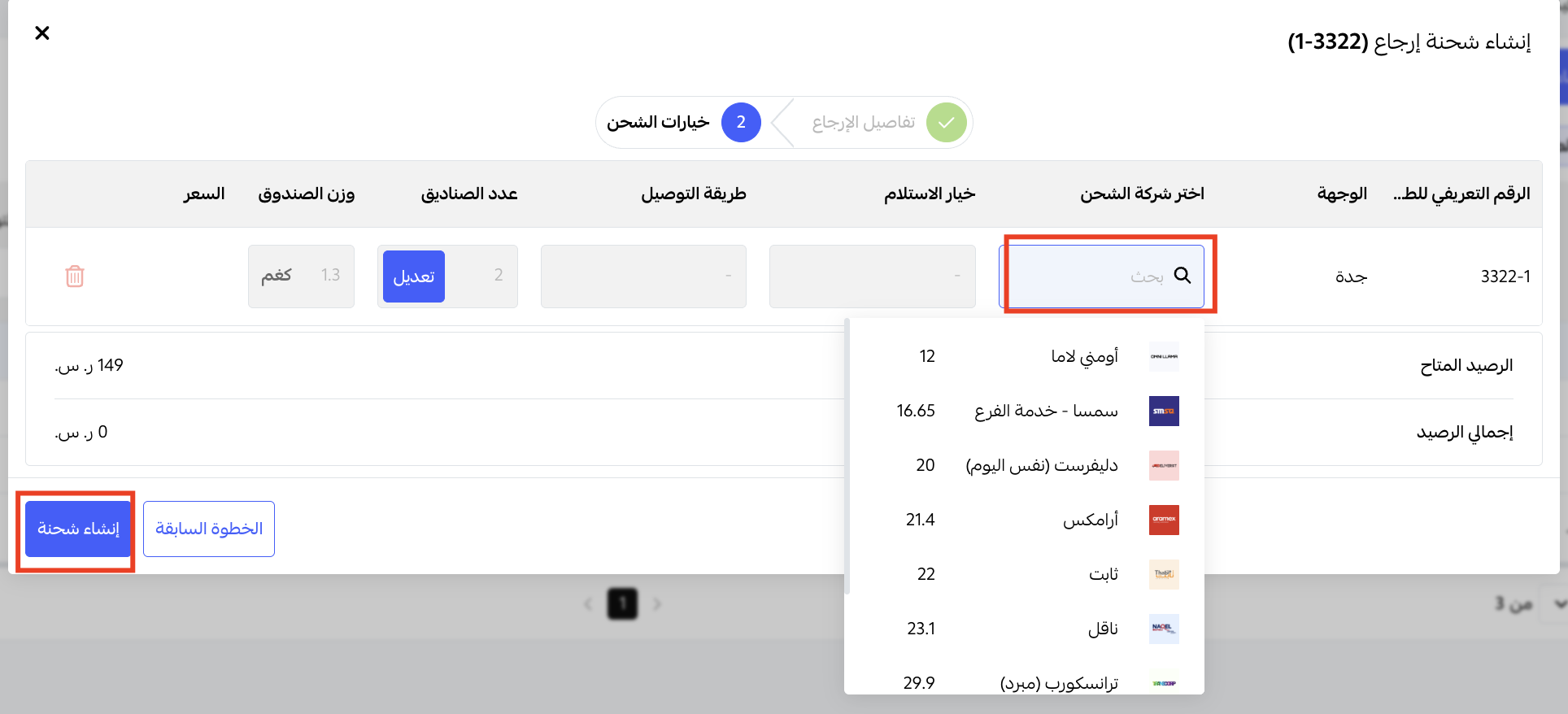 إضغط على كلمة" بحث " حتى تظهر شركات الشحن واختر الشركة المناسبة من الخيارات ثم اضغط على " إنشاء شحنة"