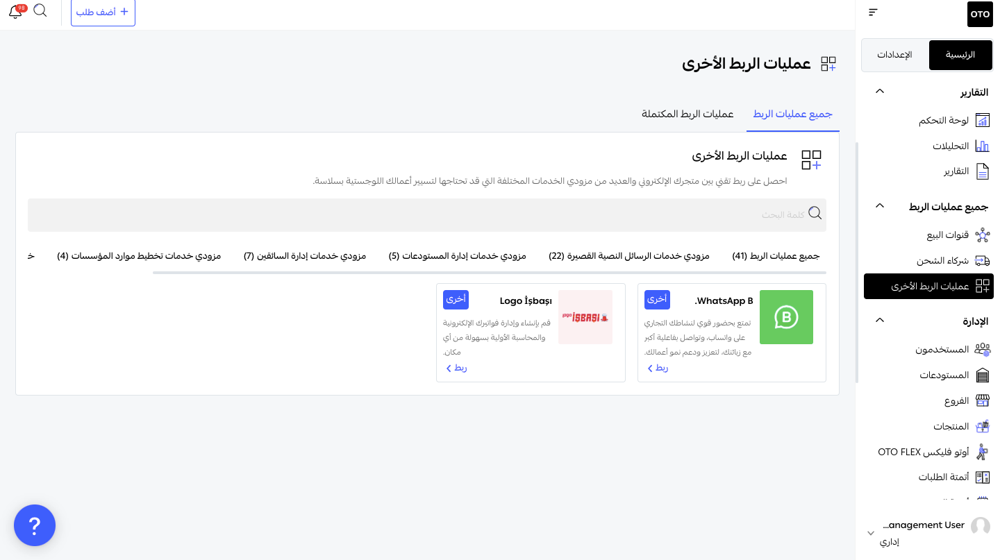 اذهب إلى علامة التبويب "عمليات الربط الأخرى" ضمن قسم الربط في لوحة تحكم OTO.