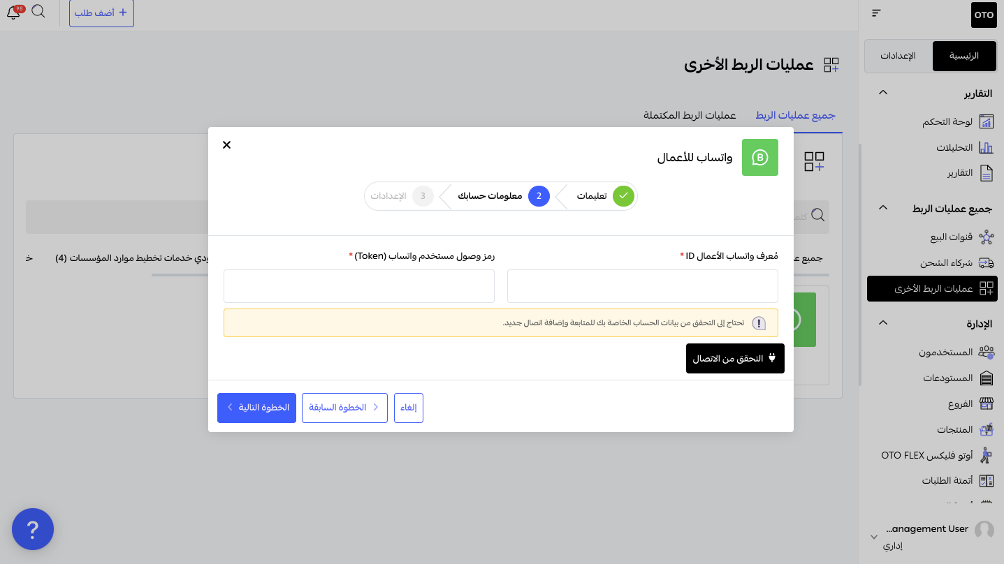 انتقل إلى عمليات الربط الأخرى > واتساب Business > اتصال.