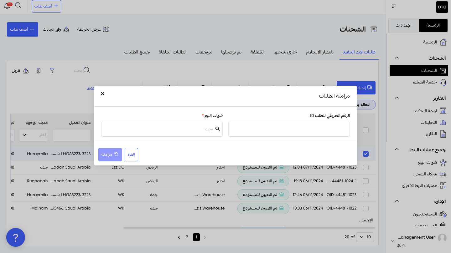 تتيح ميزة "مزامنة الطلب" في OTO للمستخدمين تحديث حالة الطلب عبر مزامنتها مع منصات التجارة الإلكترونية أو الأسواق المتصلة. تضمن هذه الميزة التقاط أي تحديثات مفقودة أو متأخرة من الأنظمة الخارجية وعكسها في منصة OTO لتحسين إدارة الطلبات. تم تصميم هذه الميزة خصيصًا للطلبات الموجودة في علامة التبويب "الطلبات المعلقة".
