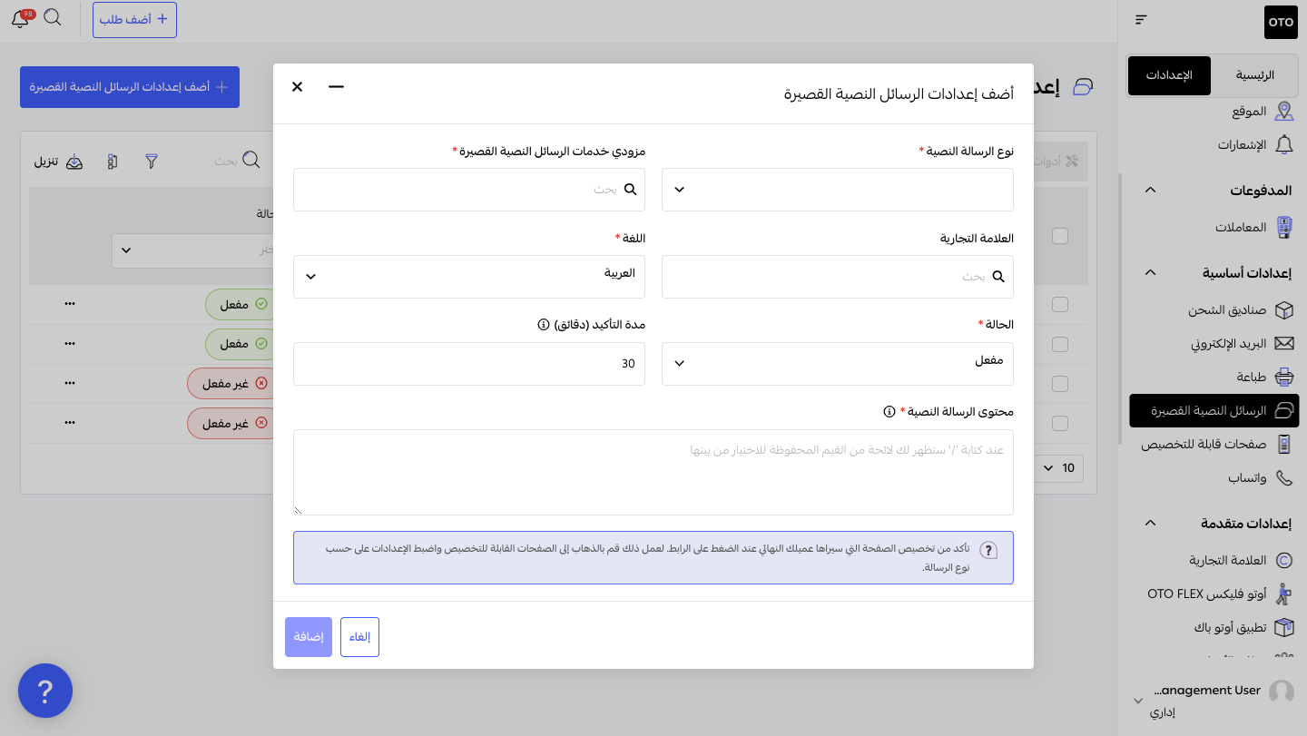 تتيح ميزة إعدادات الرسائل القصيرة في OTO للشركات إرسال رسائل نصية شخصية تحمل العلامة التجارية لأغراض متعددة مثل تأكيد الطلبات، التتبع، التعليقات، والمزيد. تتكامل هذه الميزة مع مزود خدمة الرسائل القصيرة الخاص بك وترتبط بالصفحات القابلة للتخصيص، مما يخلق تجربة تواصل متماسكة مع العملاء. من خلال إعداد أنواع الرسائل القصيرة وصفحاتها القابلة للتخصيص، يمكن للشركات تحسين التواصل وتوفير روابط تفاعلية للعملاء.