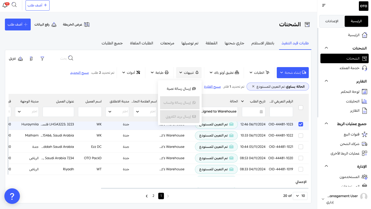 تمكّن ميزة الإشعارات في OTO المستخدمين من إرسال إشعارات يدويًا عبر الرسائل القصيرة (SMS) أو واتساب أو البريد الإلكتروني للطلبات المحددة مباشرة من صفحة الشحنات. تتيح هذه الميزة للشركات تقديم تواصل شخصي وفي الوقت المناسب لتحديثات الطلبات، محاولات التسليم الفاشلة، أو أي إشعارات هامة أخرى. تعتمد الميزة على الإعدادات والقوالب المسبقة لكل نوع من الإشعارات لتوفير تجربة سلسة للعملاء.