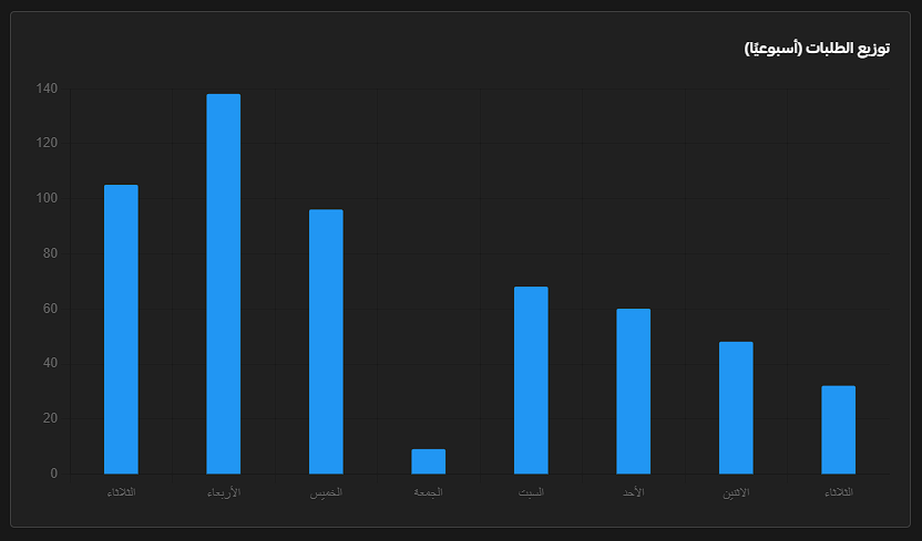 توزيع الطلبات (أسبوعيًا): يتيح لك هذا القسم تتبع وتحليل عدد الطلبات لكل يوم من أيام الأسبوع الماضي. يوفر رؤى تساعد في تحديد الأنماط أو التذبذبات التي قد تحدث في أيام معينة من الأسبوع.