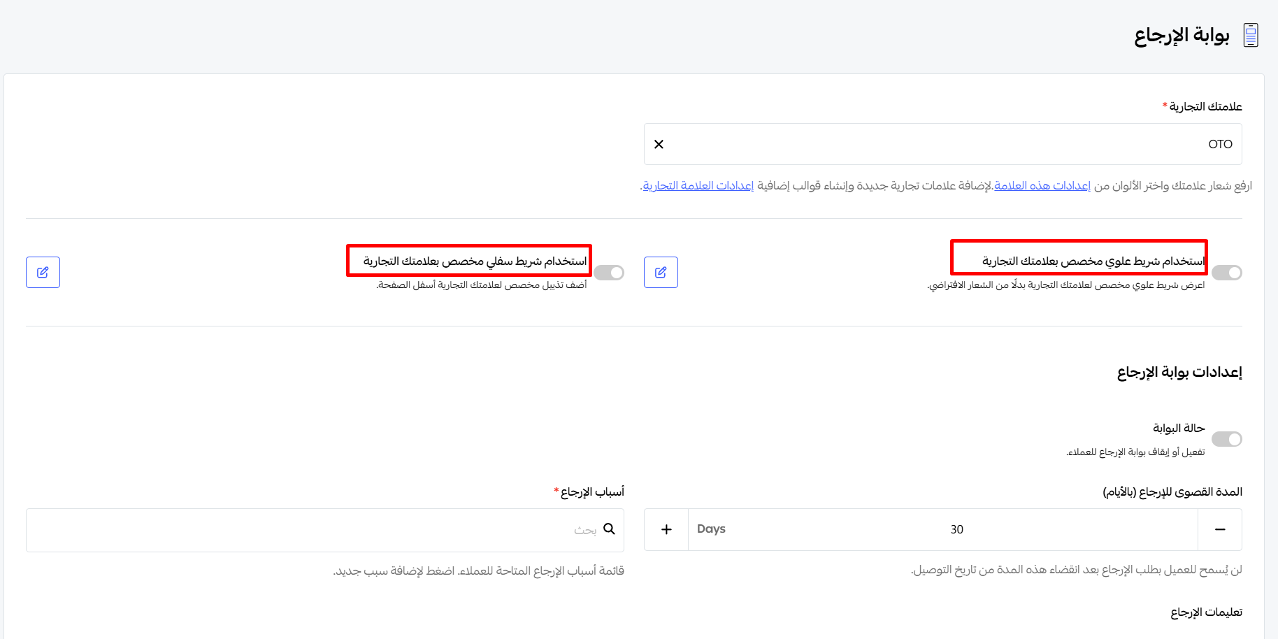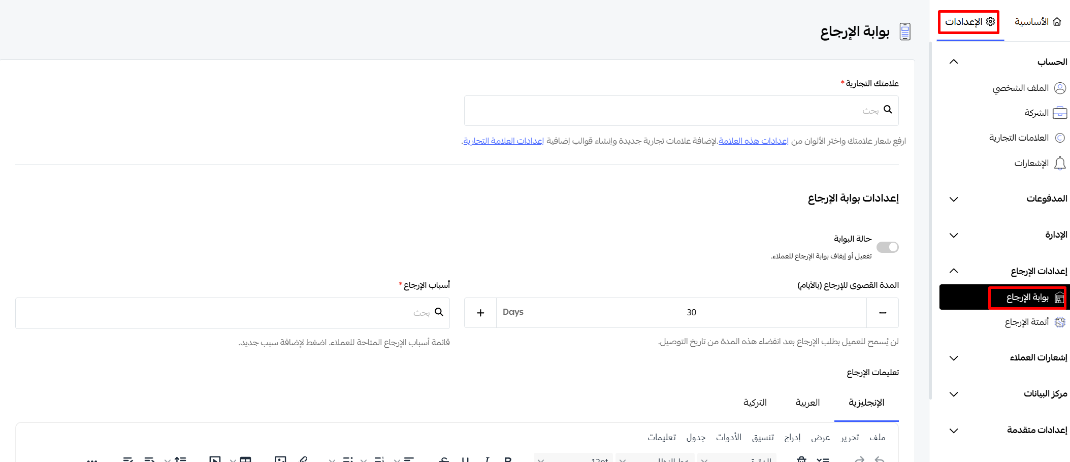 الإعدادات-إعدادات الإرجاع-بوابة الإرجاع