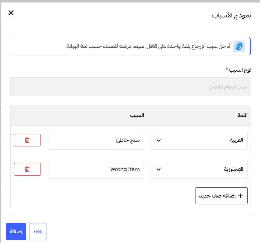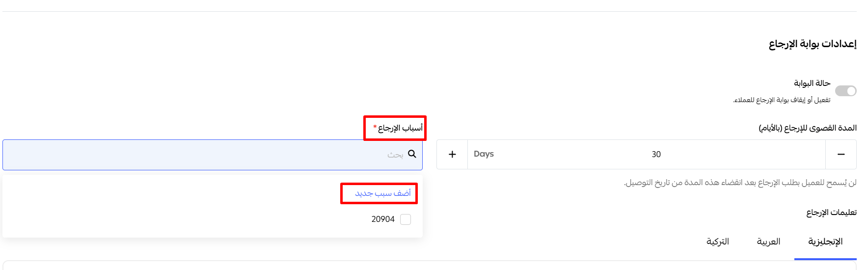 أسباب الإرجاع: يمكنك إنشاء قائمة بالأسباب (مثل: "منتج خاطئ"، "تالف"، "تغيير الرأي"). يمكن ترجمة هذه الأسباب إلى عدة لغات، بما في ذلك الإنجليزية والعربية والتركية.