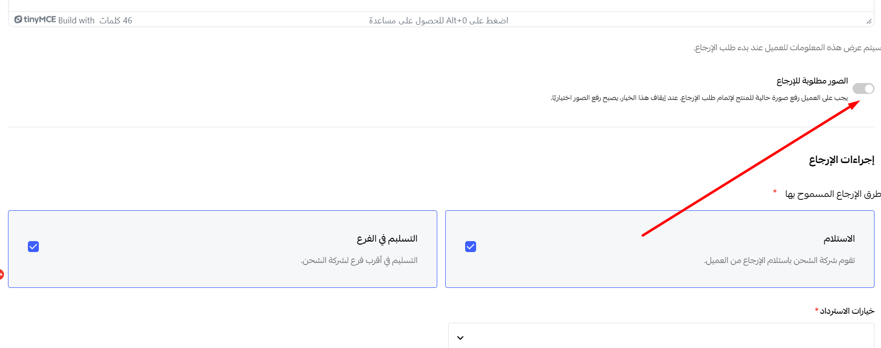 تعليمات الإرجاع: استخدم محرر النصوص لتقديم تعليمات واضحة خطوة بخطوة (مثل: "يجب أن تكون المنتجات في عبوتها الأصلية").