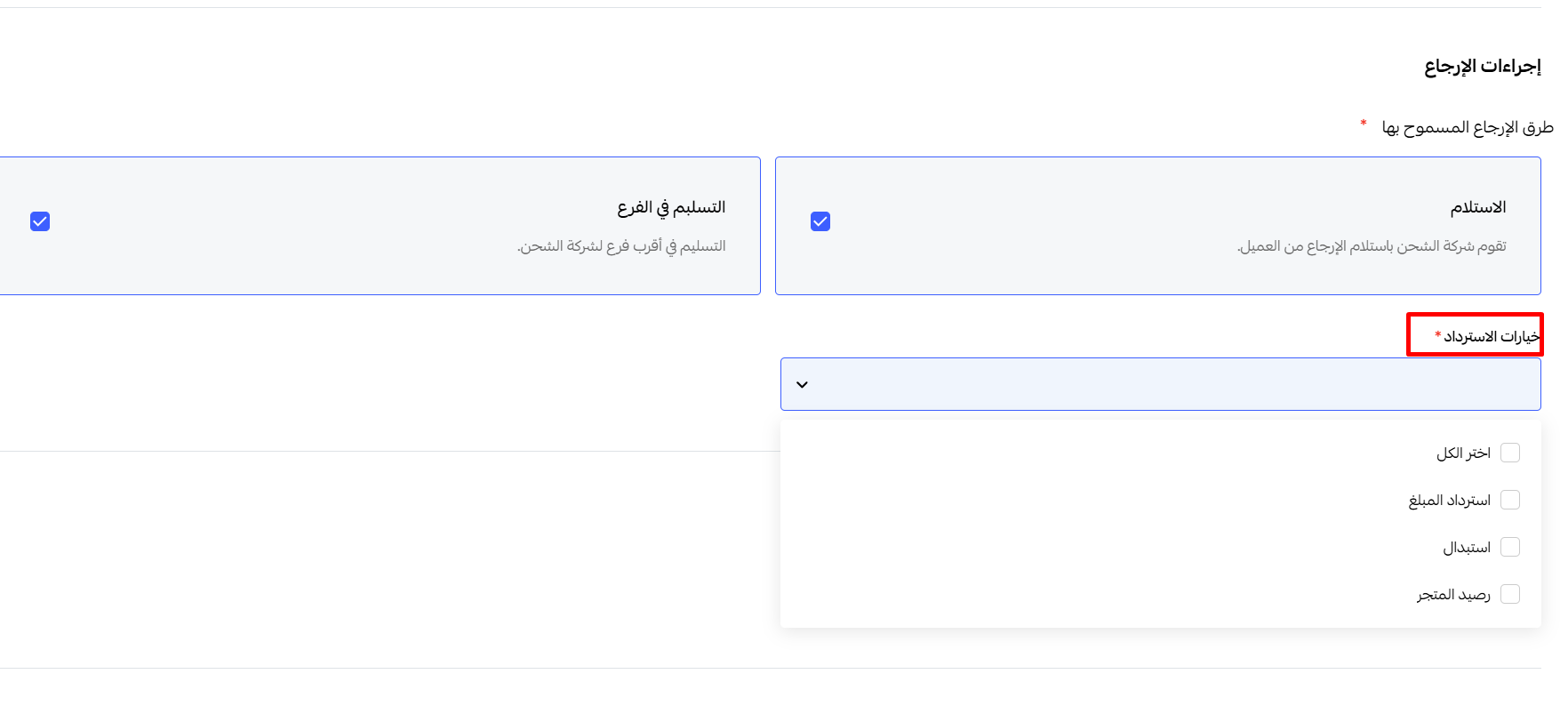الإرجاع في المتجر (In-Store): يقوم العميل بإرجاع المنتج إلى فرع فعلي. عند التفعيل، سيُطلب من العميل اختيار فرع محدد من قائمتك.