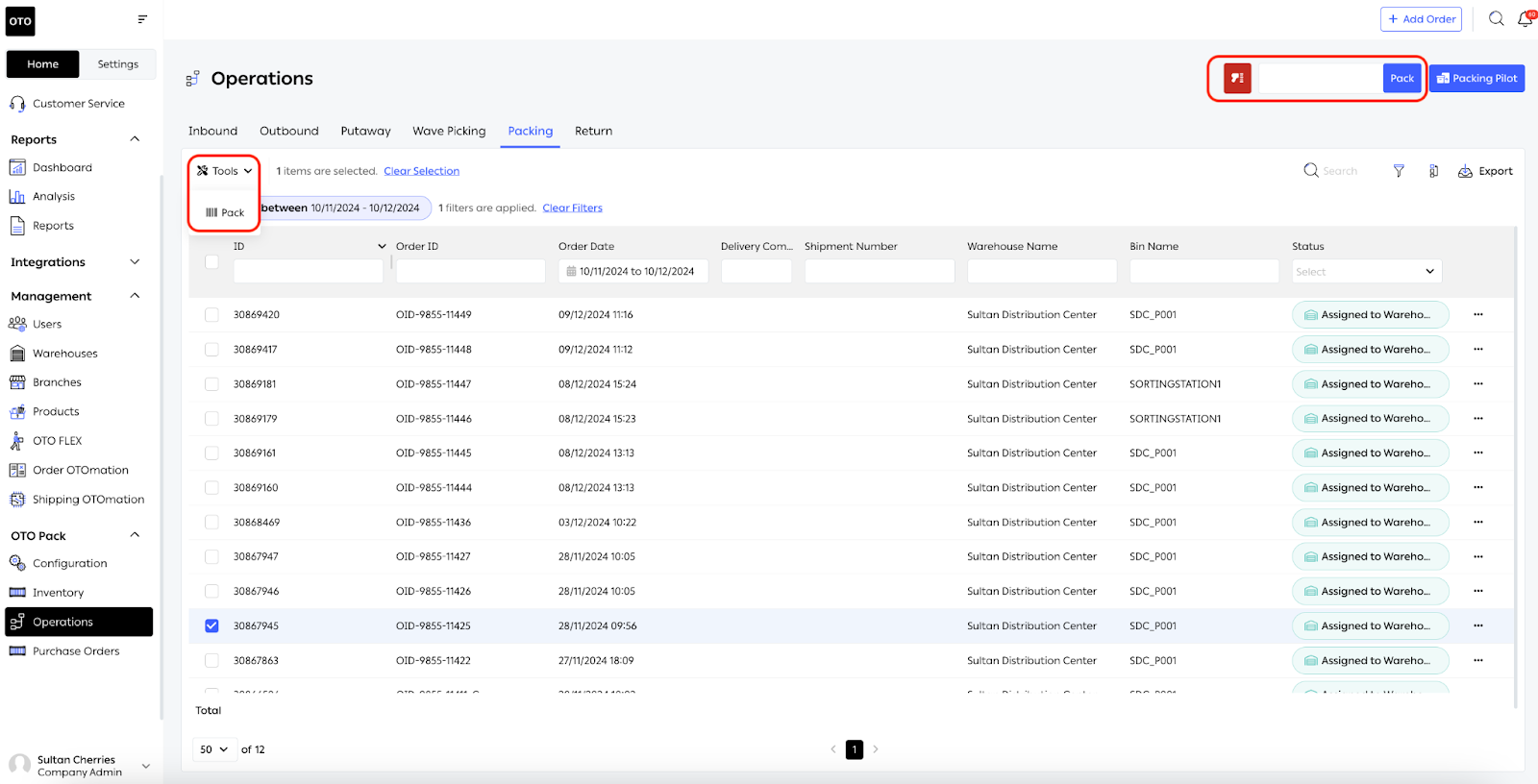 Navigate to OTO PACK > Operations > Packing > Packing Pilot.