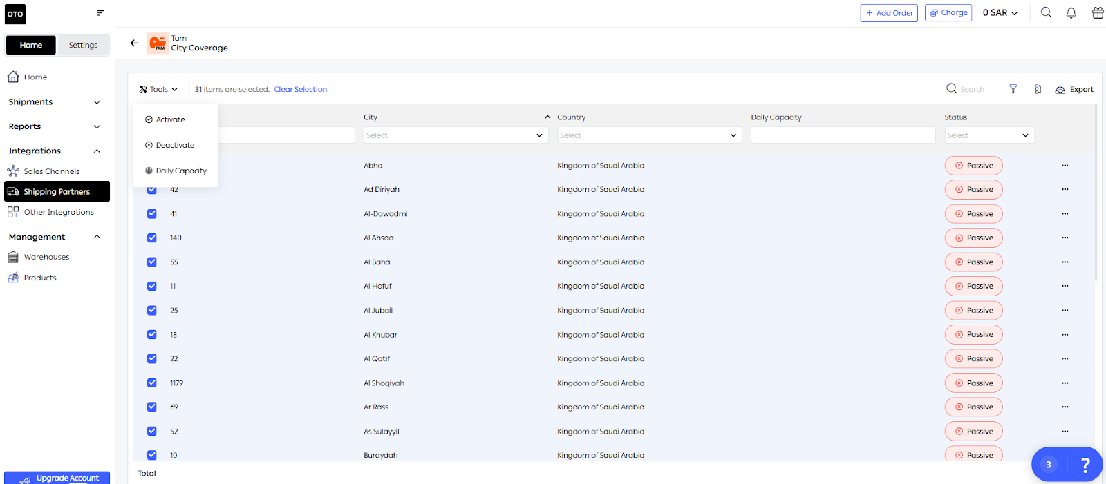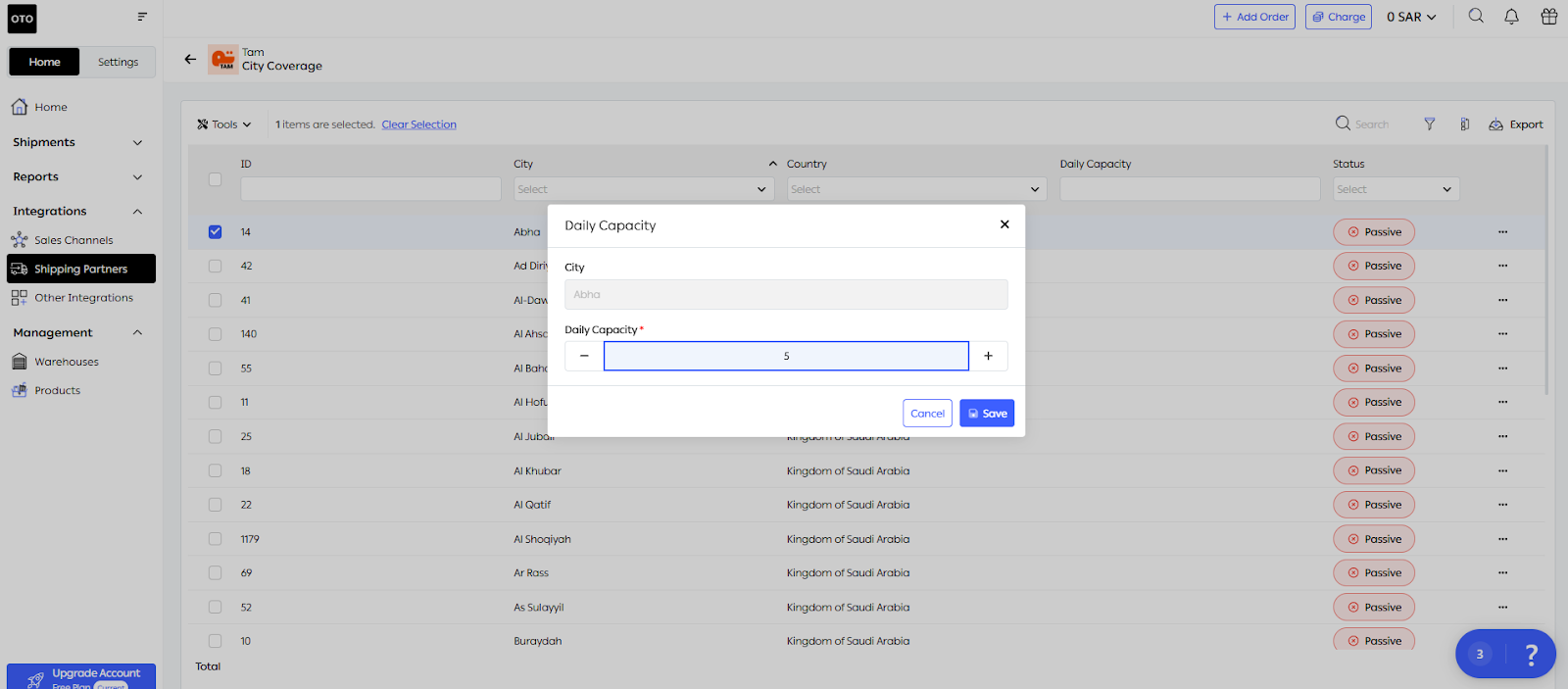 Feature Name: Shipping Partners Sub Settings / City Coverage & Daily Capacity Settings