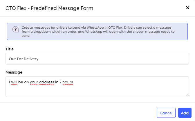 Create messages for drivers to send via WhatsApp in OTO Flex. Drivers can select a message from a dropdown within an order, and WhatsApp will open with the chosen message ready to send.