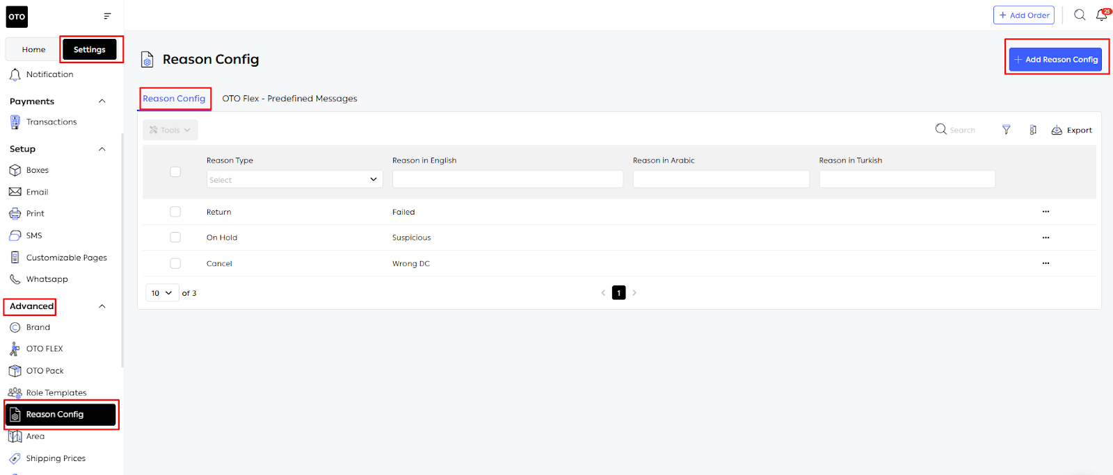Reason configuration is a tool to help you configure reasons for your failed orders such as ones that are returned, on hold or canceled etc. You can specify the reason why an order is failed or returned both via the dashboard and if you are an OTO flex user, via OTO Flex. This will help you understand why the product is returned or failed later.