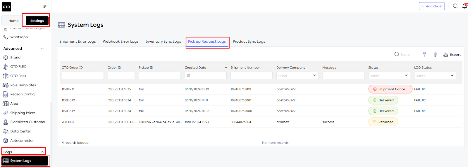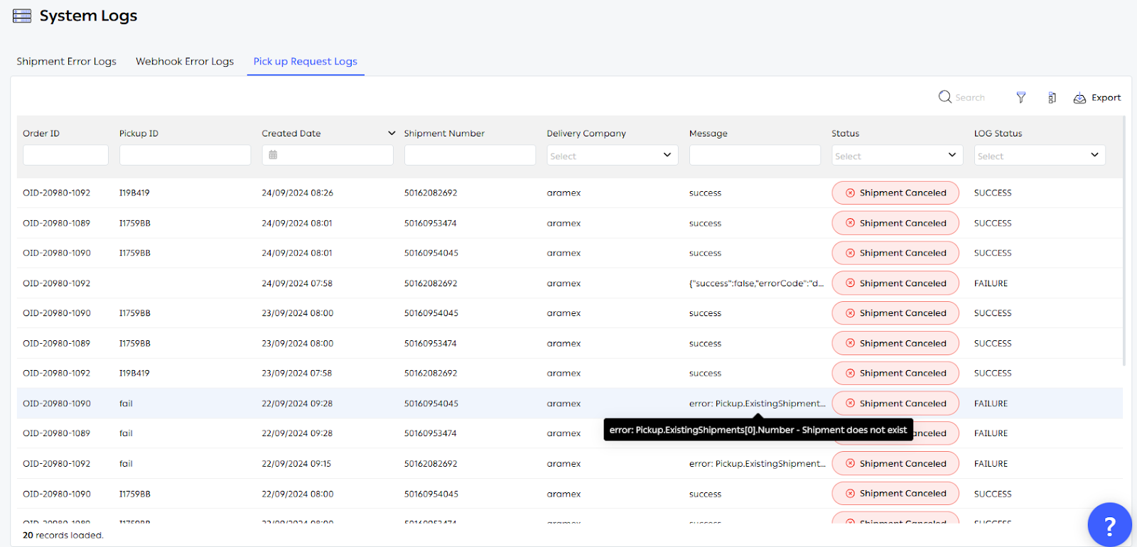 The Pickup Request Log is a feature designed to track and manage records of all pickup requests sent to delivery companies. It serves as a central repository for monitoring both successful and failed pickup requests, providing valuable insights and enabling you to troubleshoot and resolve any issues effectively.