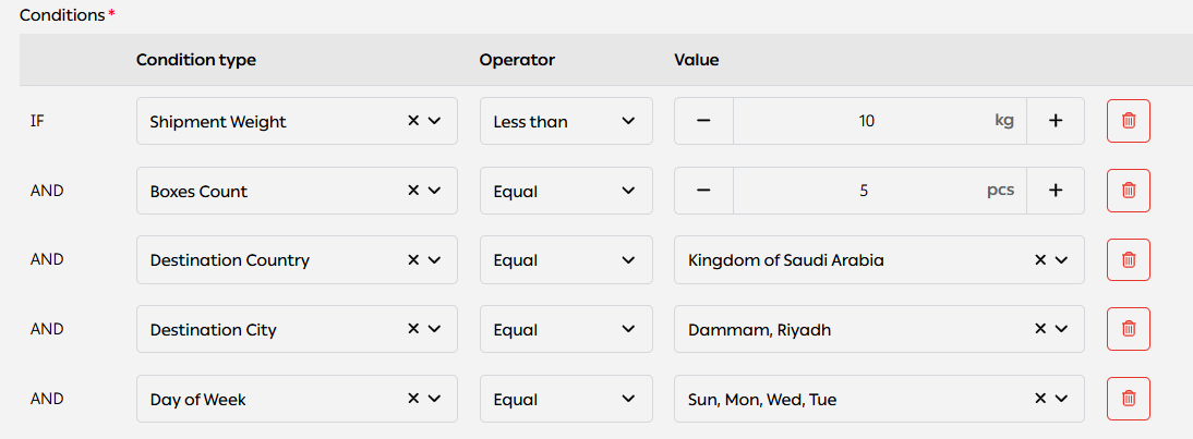 Condition Type: You can set your rule based on certain conditions. For example, brand, category, package size, quantity, weight, origin or destination city and country etc.
