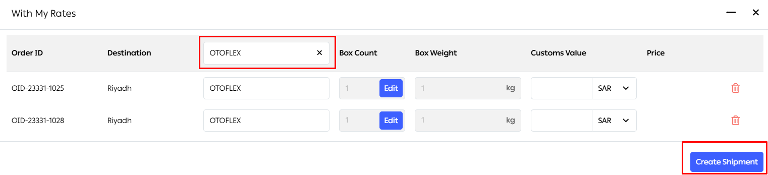 Select the order/orders you want to ship with your own agreements and click on Create Shipment button.