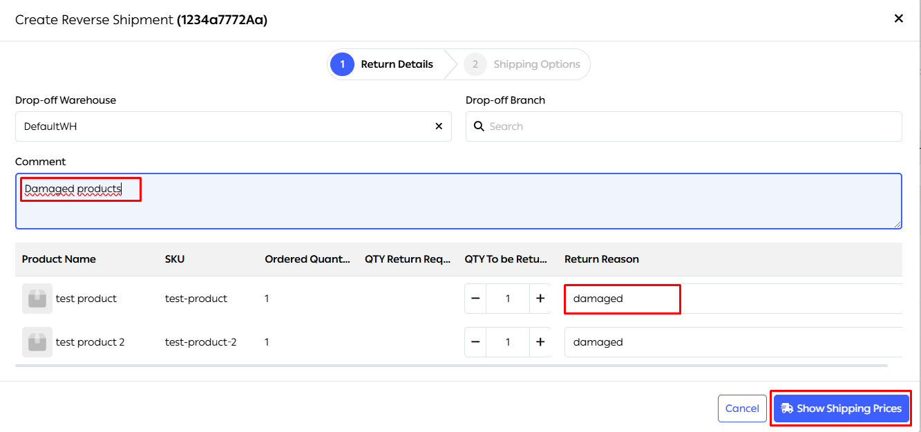 Drop-off Warehouse: Warehouse to which the shipment will be returned