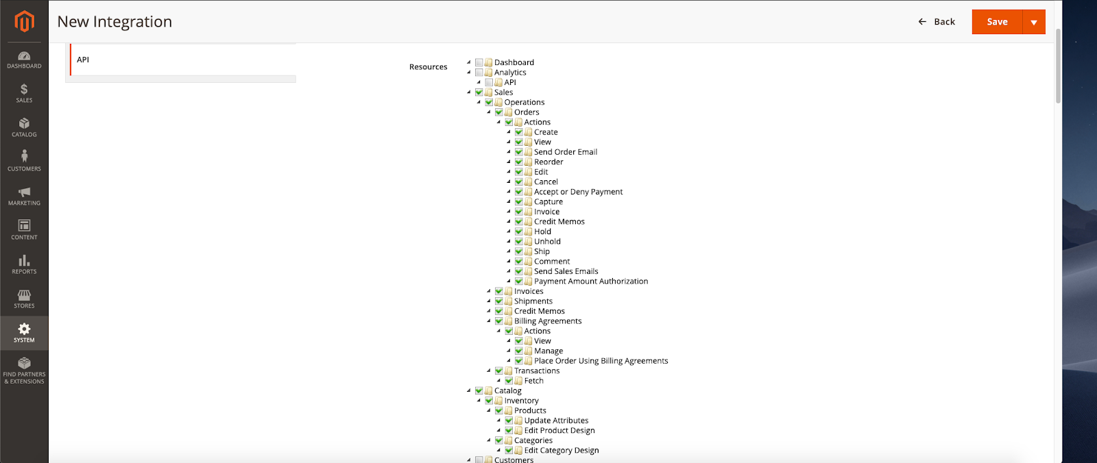 3. Enter a name for this integration. Click on the API tab and select custom resources and check the Sales and Catalog as shown in the screenshot below.