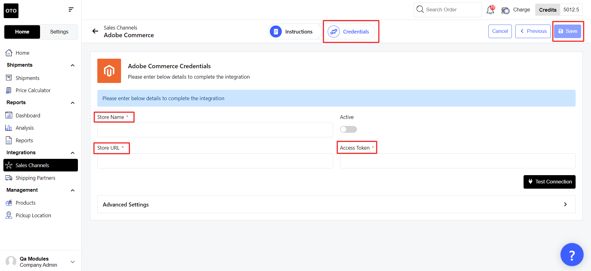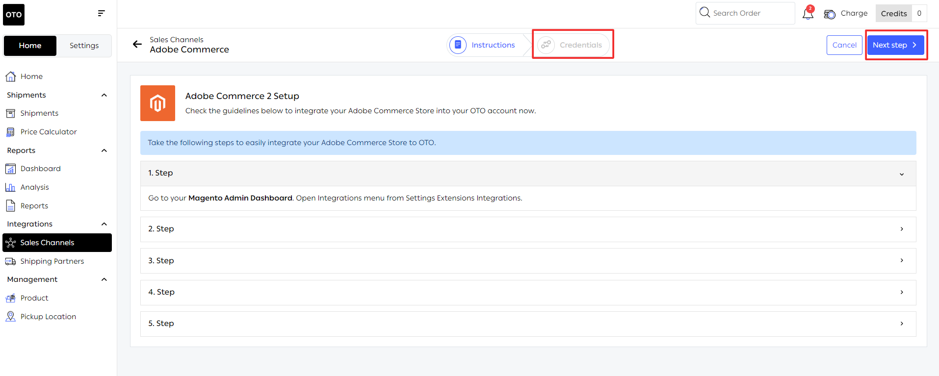 - Go to your OTO account. Click on Home >> Sales Channels >> then choose Adobe Commerce