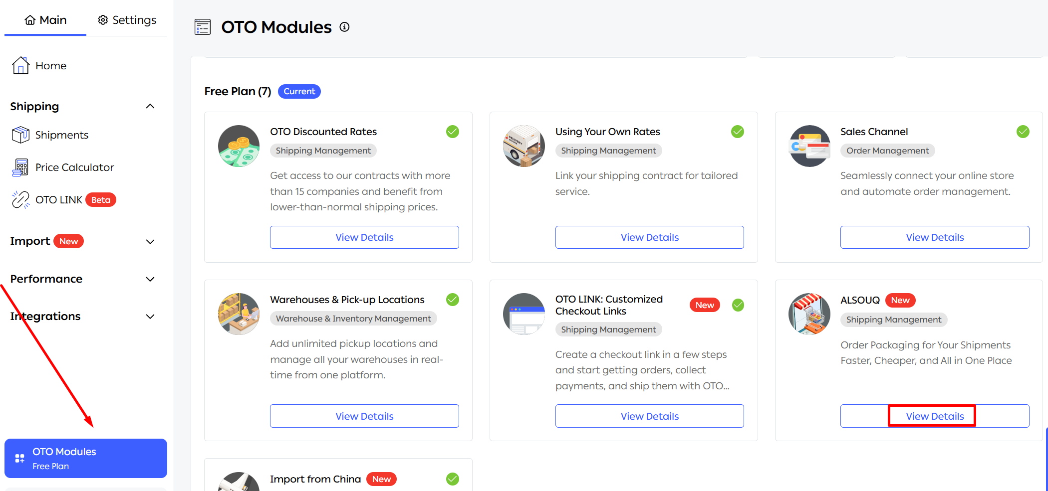 ALSOUQ module allows you to easily purchase packaging materials such as boxes,bags,tapes, and more directly from your OTO dashboard. With ALSOUQ, you benefit from competitive prices, direct delivery to your warehouse or preferred address, and seamless order management all within the OTO platform.