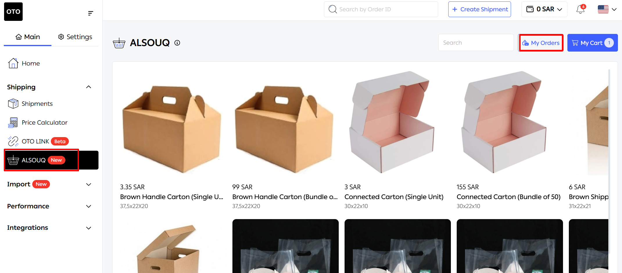 ALSOUQ allows you to order packaging materials like boxes, tape, and more directly from your OTO dashboard.