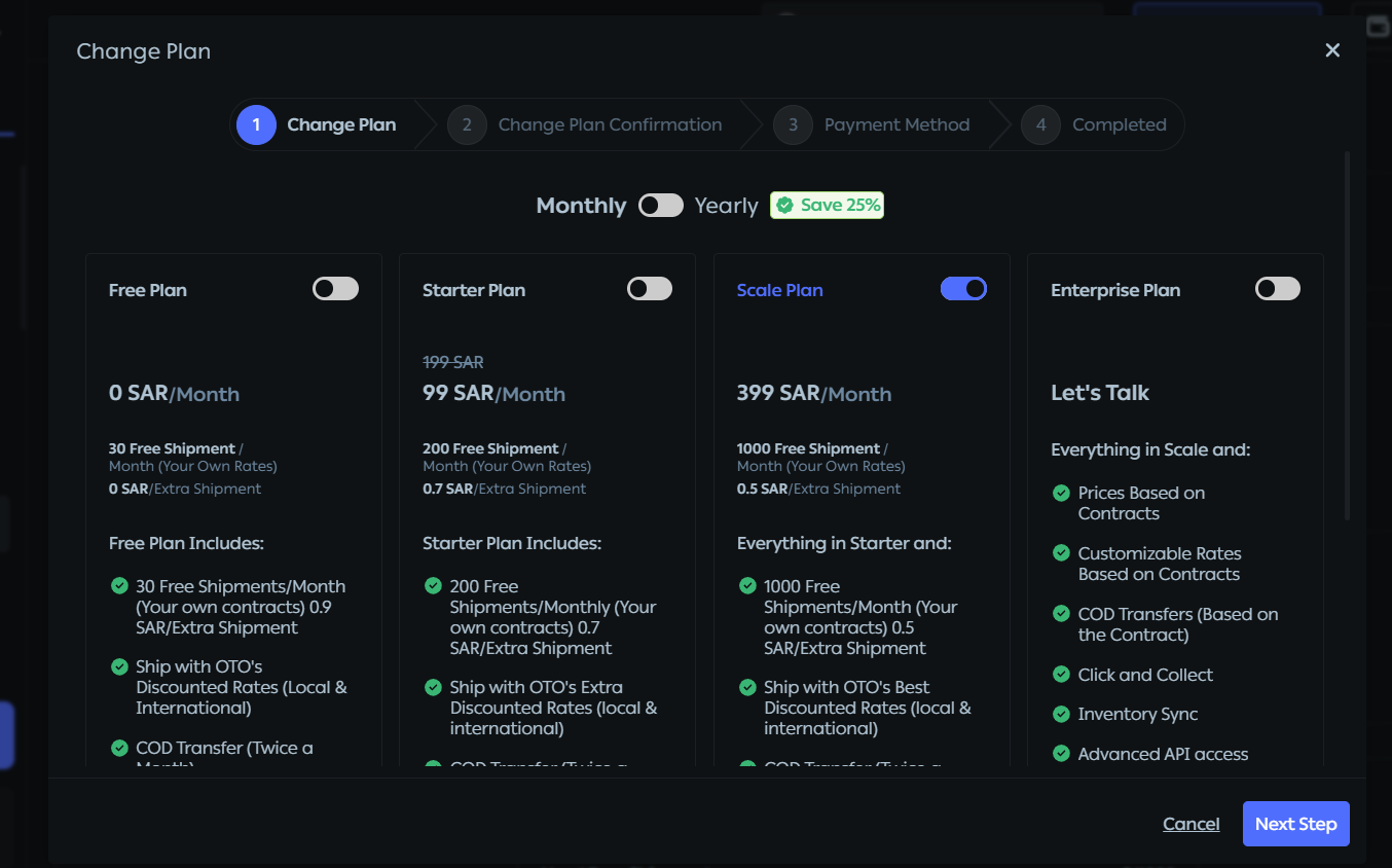 Scale Plan – 399 SAR/month, ideal for growing businesses with 1000 free shipments when using your own rates and the best discounted shipping rates.