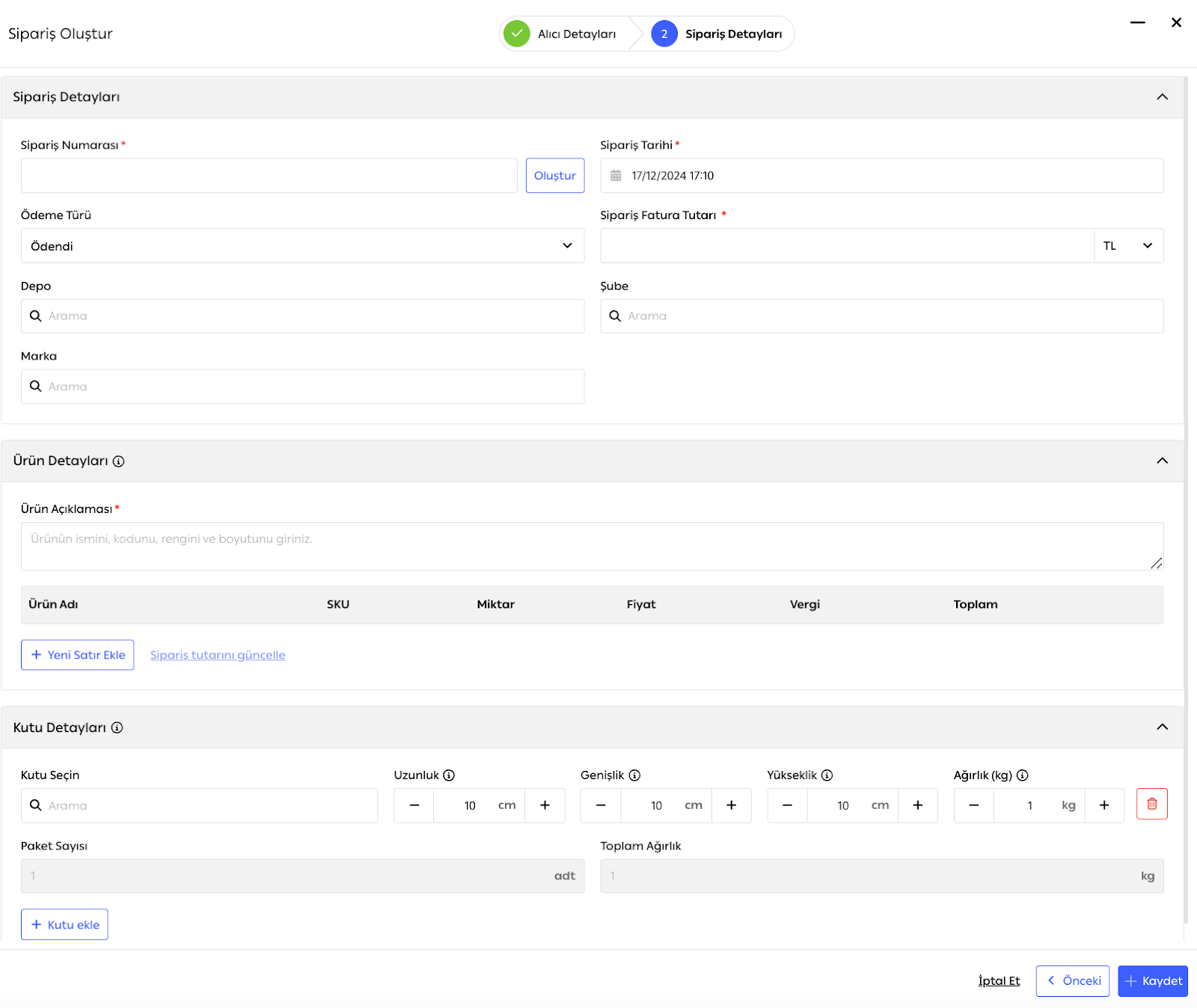 Çözüm: Tüm gerekli alanların (yıldız işaretiyle işaretlenmiş olanlar) doldurulduğundan emin olun. Alıcı iletişim bilgilerini, ürün bilgilerini ve kutu boyutlarını doğrulayın.Sorun: Bir siparişe birden fazla ürün ekleyebilir miyim?