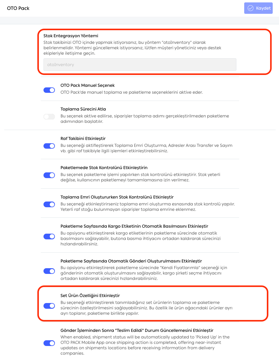 OTO'yu Stok Merkezi Olarak Etkinleştirin: OtoInventory stok entegrasyon türünü seçerek otomatik güncellemeleri etkinleştirin.