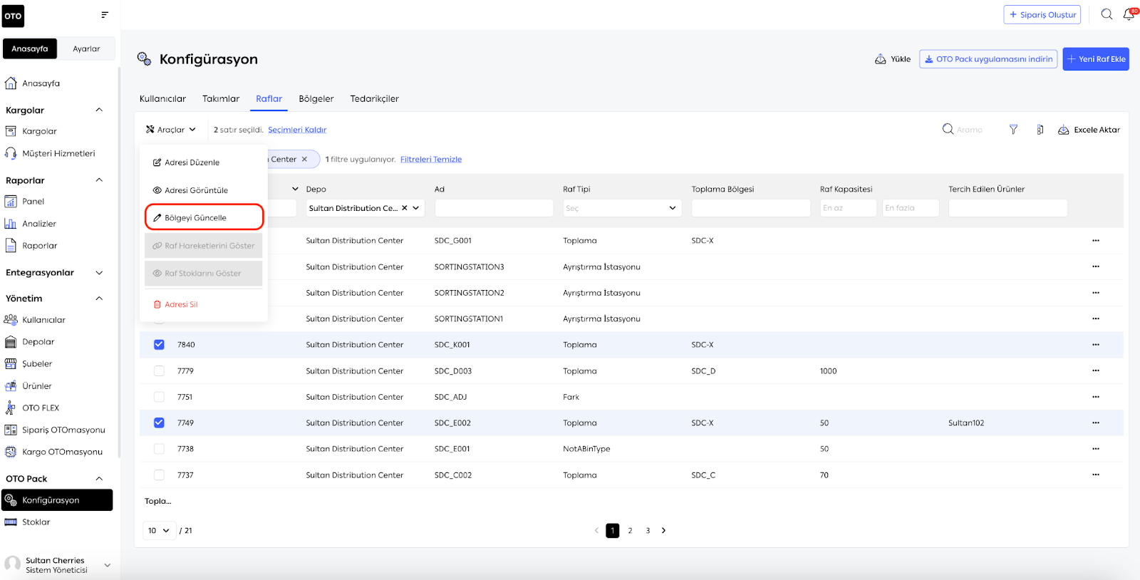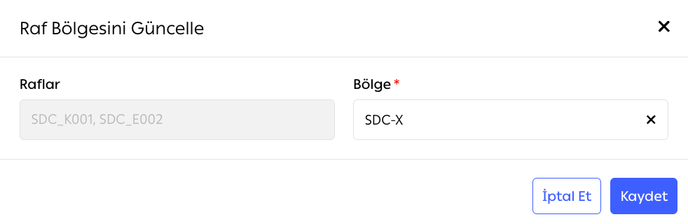 Rafları bölgelere bağlamak, depo iş akışının düzenli kalmasını sağlar. Bağlantıyı kurmak için: