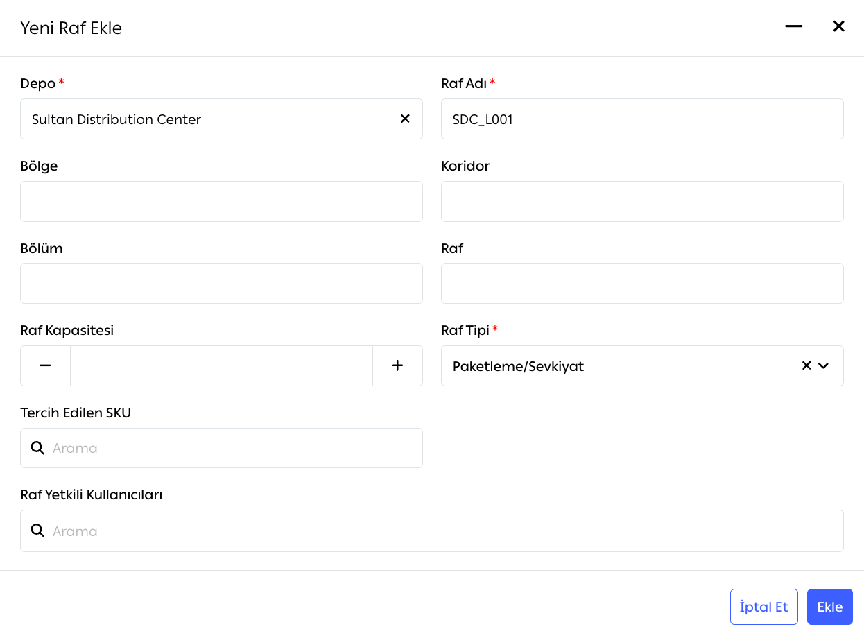 Raf Kapasitesi ve Tercih Edilen SKU: Rafın kapasitesi ve atanmış SKU, eğer gerekiyorsa.