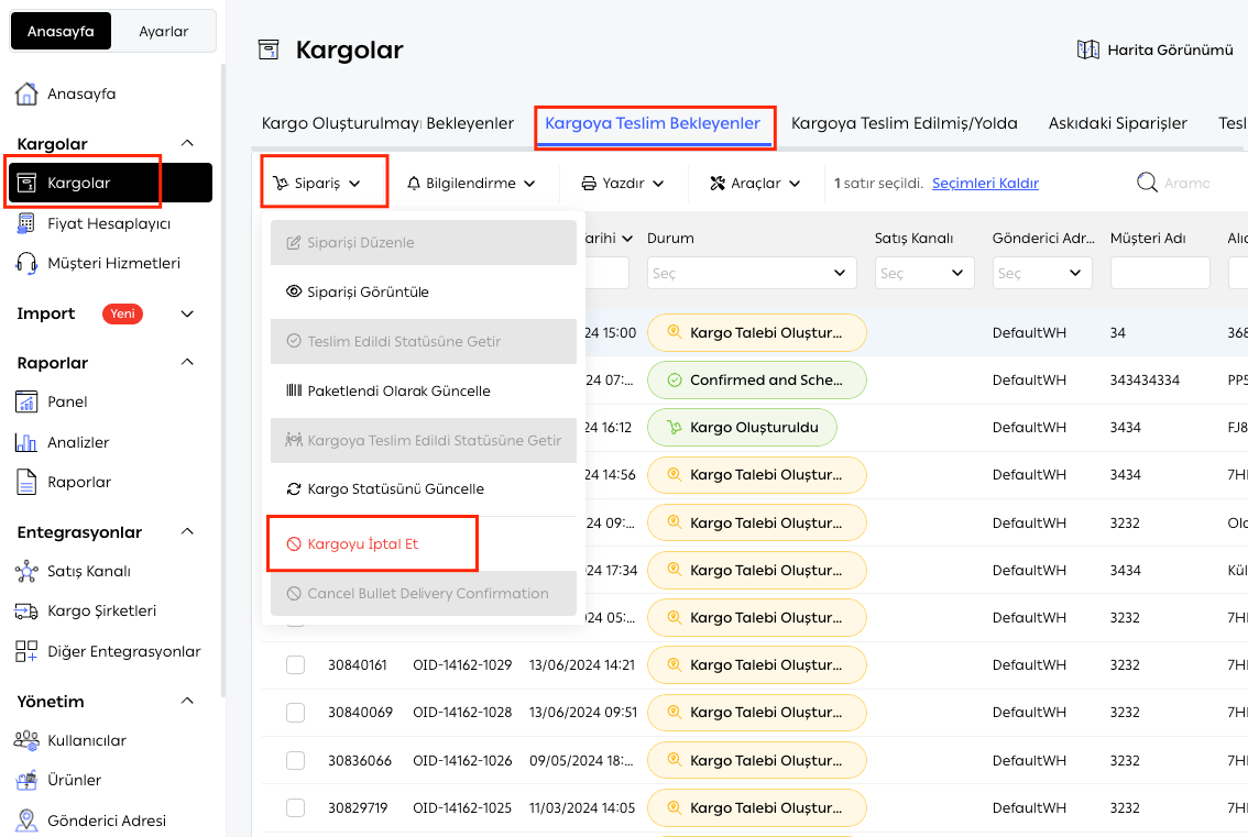 3. İptal etmek istediğiniz kargoyu seçin ve Sipariş menüsünden Kargoyu İptal Et'e tıklayın.
