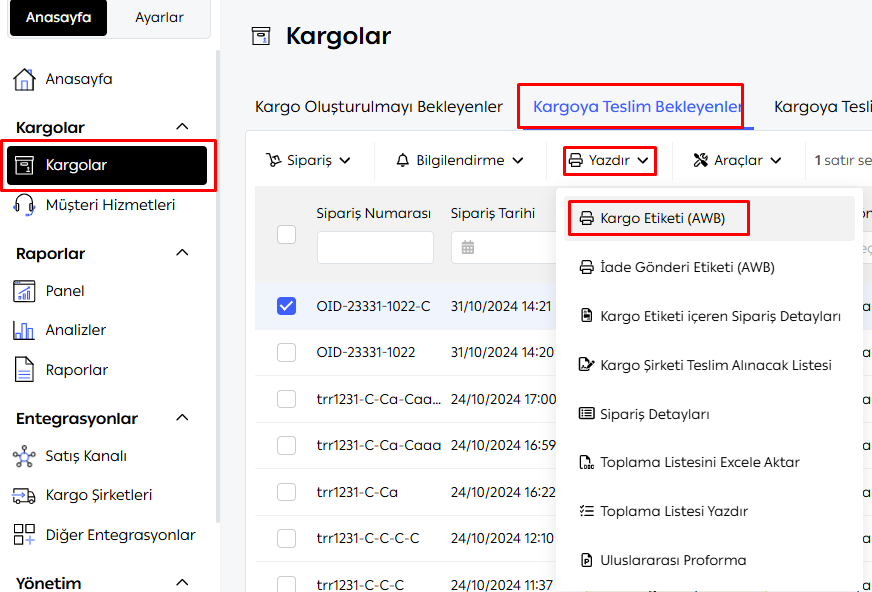 Yazdır butonuna tıklayın -> Kargo Etiketi (AWB) seçeneğini seçin.
