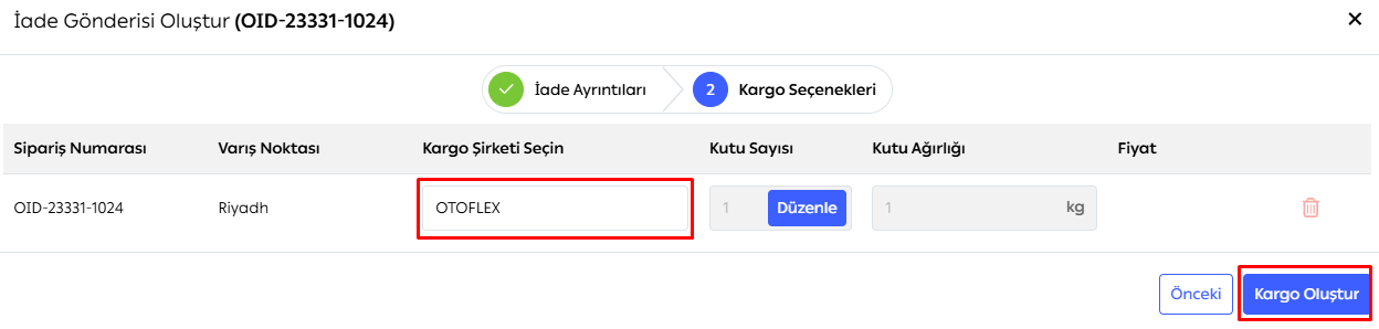 Kendi anlaşmalarınızla tersine gönderi oluşturmak istediğiniz siparişi seçin ve Gönderi Oluştur butonuna tıklayın.