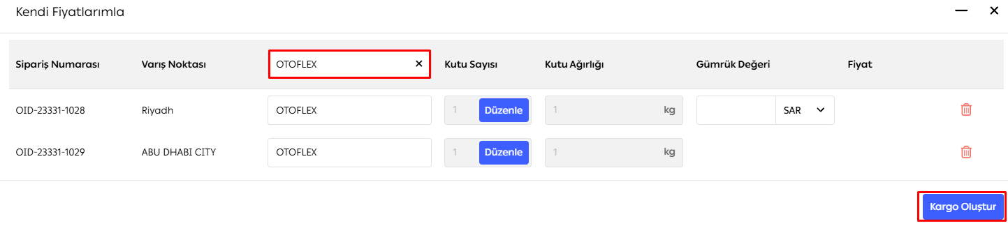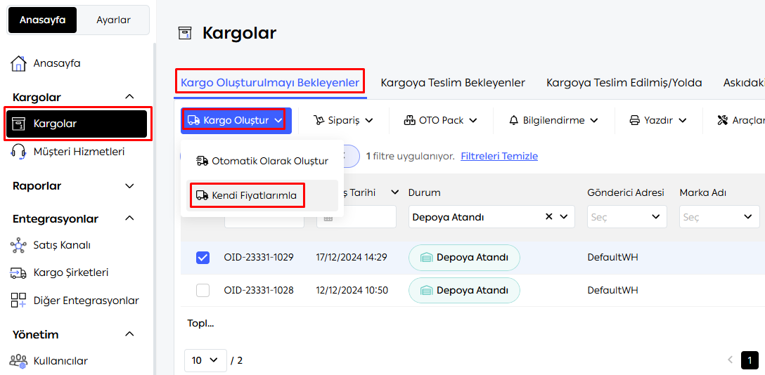 Kendi anlaşmalarınızla göndermek istediğiniz siparişleri seçin ve Kargo Oluştur butonuna tıklayın.