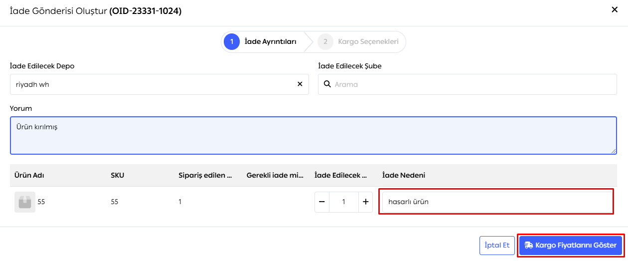 Yorum: İsteğe bağlı bir alan; iade hakkında yorum girebilirsiniz.